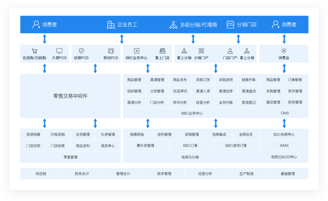 通過敏捷前臺(tái)、共享中臺(tái)、多元后臺(tái),打通全渠道數(shù)據(jù)和營銷業(yè)務(wù),實(shí)現(xiàn)全網(wǎng)訂單統(tǒng)一管理,全局庫存統(tǒng)一分配,全網(wǎng)會(huì)員精準(zhǔn)營銷,以及業(yè)財(cái)融合的一體化解決方案